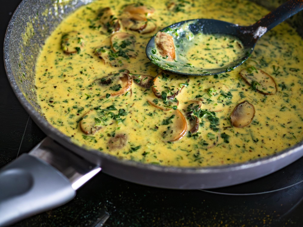 Під час приготування гриби спершу обсмажують до випаровування природної вологи, що дозволяє розкрити аромат. Після додавання цибулі маса стає м’якшою, а вершки поступово формують кремову структуру. Помірний нагрів допомагає зберегти однорідність соусу, а кілька хвилин настоювання перед подачею роблять текстуру стабільнішою та смак більш виразним.