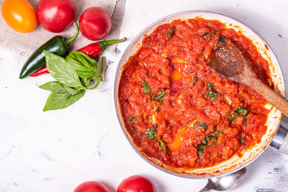 Якщо використовуються свіжі помідори, їх занурюють у гарячу воду на кілька секунд, знімають шкірку та подрібнюють. М’якоть тушкують на невеликій кількості оливкової олії разом із дрібно нарізаною цибулею та часником приблизно 10–15 хвилин до природного загущення. Кислотність регулюється дрібкою цукру або тривалішим уварюванням.